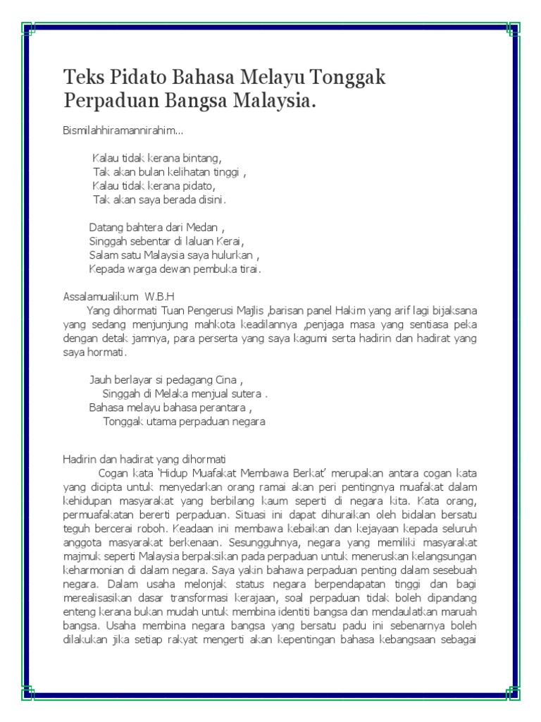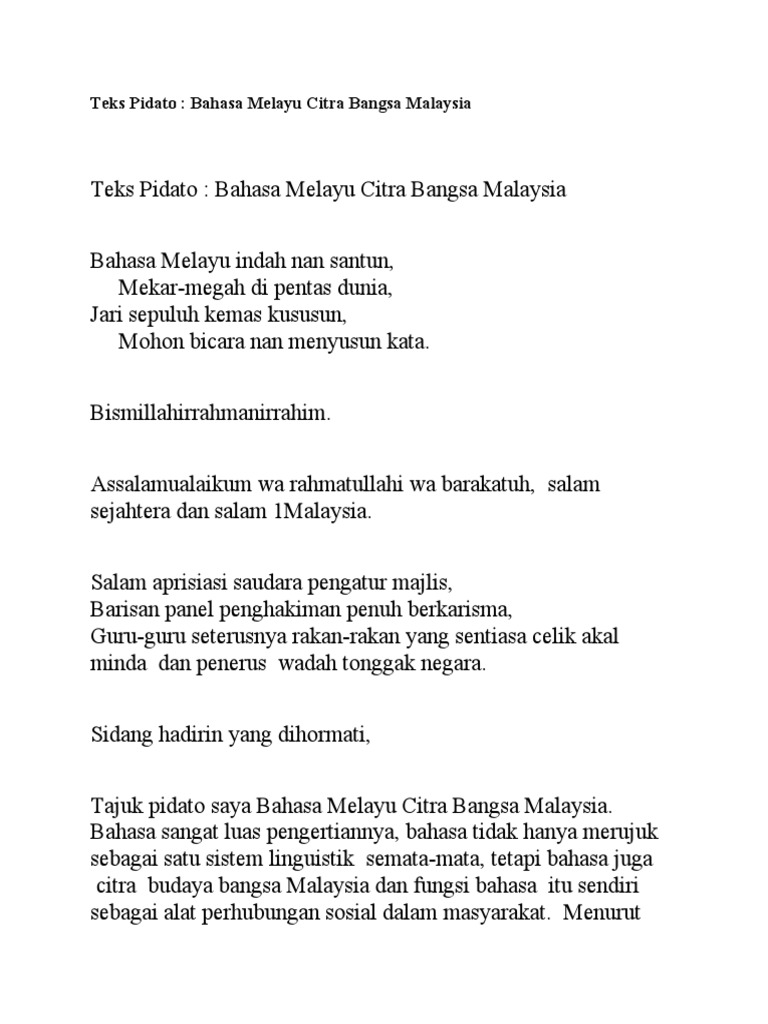Contoh pidato bahasa indonesia memang sangatlah tidak mudah kita bisa berpidato dengan baik di depan umum. 12 contoh pidato singkat tema persatuan. Bahasa melayu merupakan wasilah terpenting dalam menyatukan bangsa malaysia. Savesave contoh karangan bahasa melayu ( pidato ) for later. Yang terhormat bapak anas akhmadi m.pd selaku.