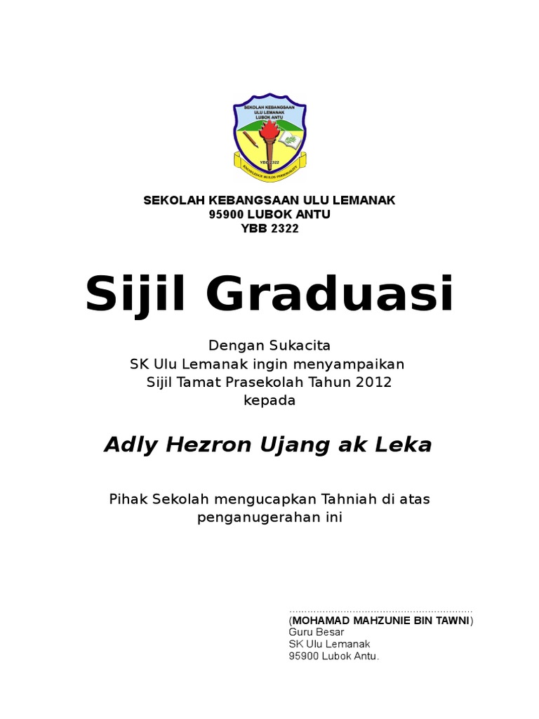 Sijil Graduasi Tahun 6 : Penyampaian hadiah graduasi dan sijil jangkamasa 1 hari penyeliaan 1.. Majlis penyampaian sijil tamat prasekolah & graduasi tahun 6, 2019. Bagi sijil graduasi tahun 6:*rujuk buku program. Syed saddiq berpendapat pentas graduasi bukanlah tempat untuk meluahkan rasa marah dan namun, beliau juga tidak bersetuju gesaan untuk menarik balik ijazah graduan tersebut yang telah berusaha selama lebih 4 tahun. Semoga berjaya di masa hadapan. Majlis graduasi ini akan menjadi pemangkin dalam merealisasikan segala hasrat dan harapan terkandung dalam visi dan misi sekolah.